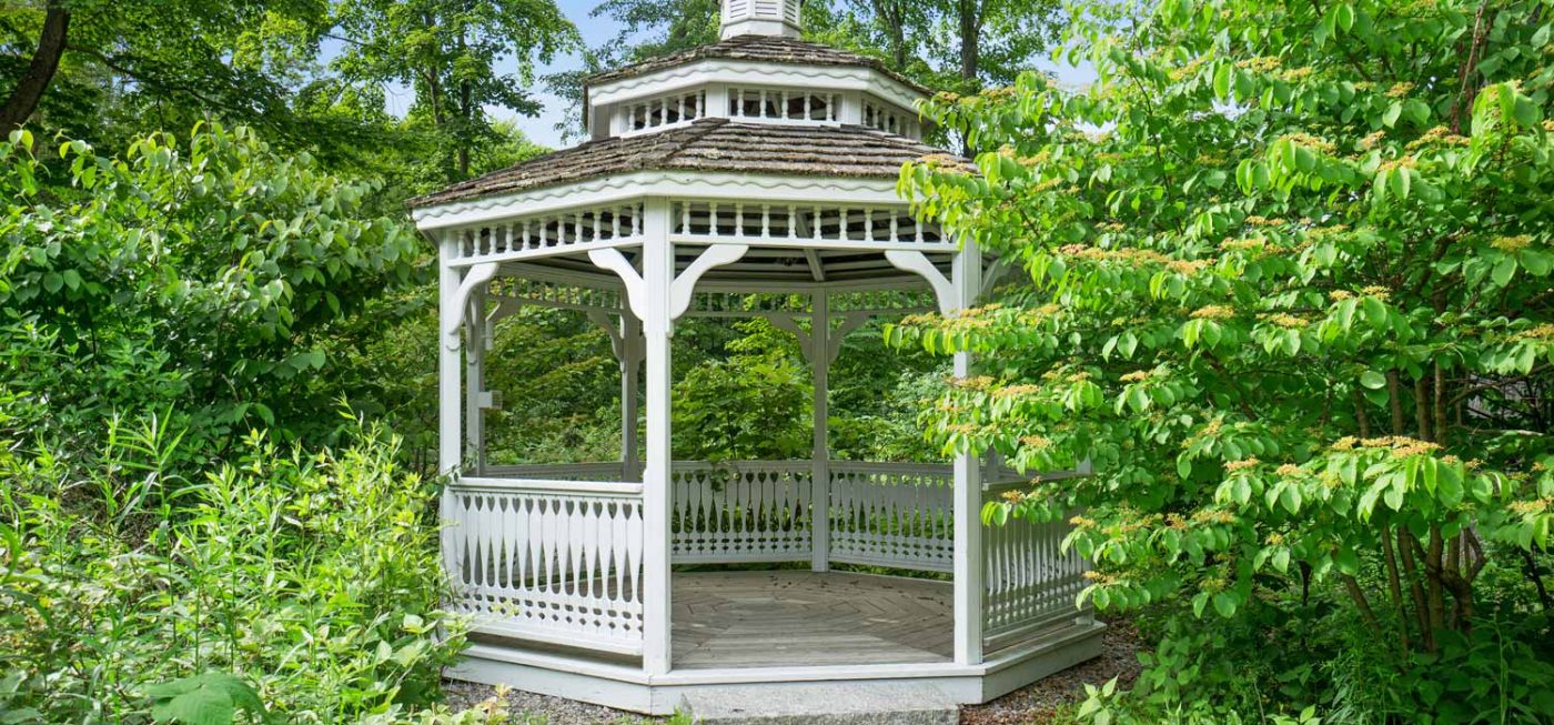 Landscape plans were developed with Studer Design Associates of Ridgefield, and include a 60-ft pond, in-ground spa with rock waterfall, multiple gardens and a gazebo (conceptual plans are also available for the addition of an in-ground swimming pool). Scaping Falls Nursery and Gardens of Scarsdale constructed the 6,000 sf of paved driveway, 3,000 sf of stone terraces and stone walls that enhance the beauty of the landscaping. A small garden building neatly stores supplies, and the sides and rear of the property are fenced with 8-ft, black-coated fencing to deter deer.