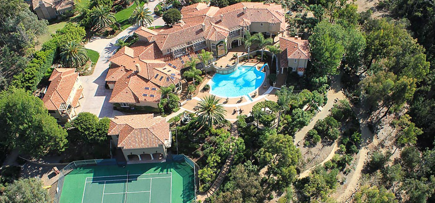 The Property’s three outbuildings include a two-story guesthouse, staff apartment, and studio. Other outdoor amenities include a massive loggia off of the main residence, featuring an oversized summer kitchen, lounge area with fireplace, and additional dining area. There is also a spectacular, resort-style pool with water features, water slide and an adjacent spa tub, which is centrally located amidst the four living structures. Garage parking for six vehicles includes a limo bay, storage and laundry.