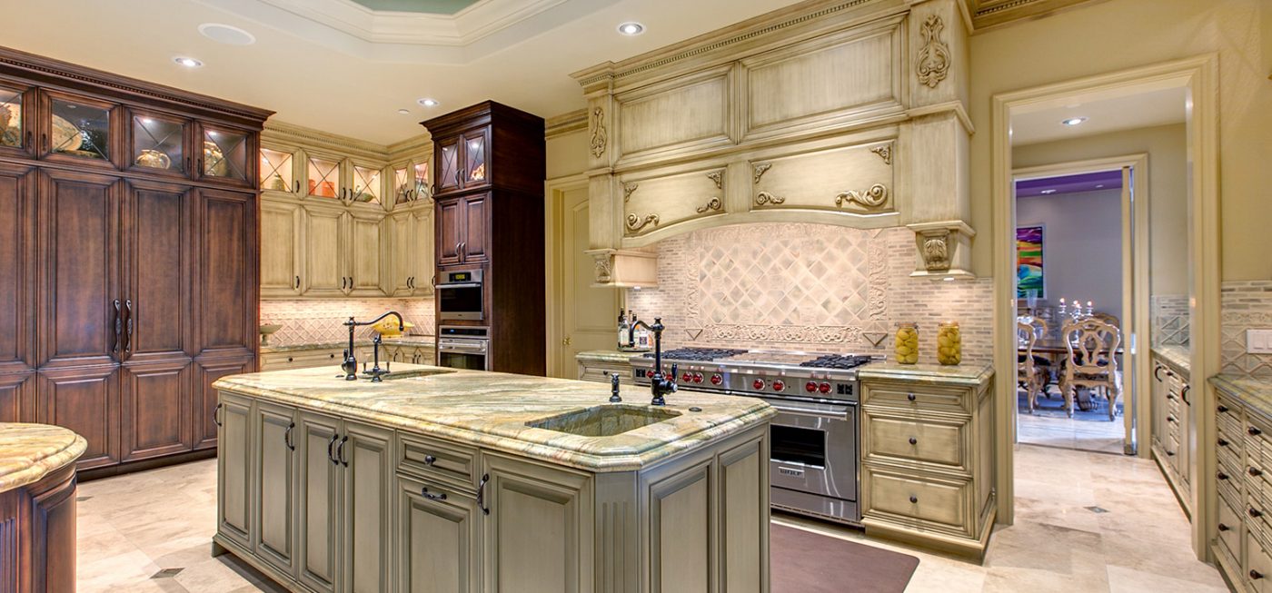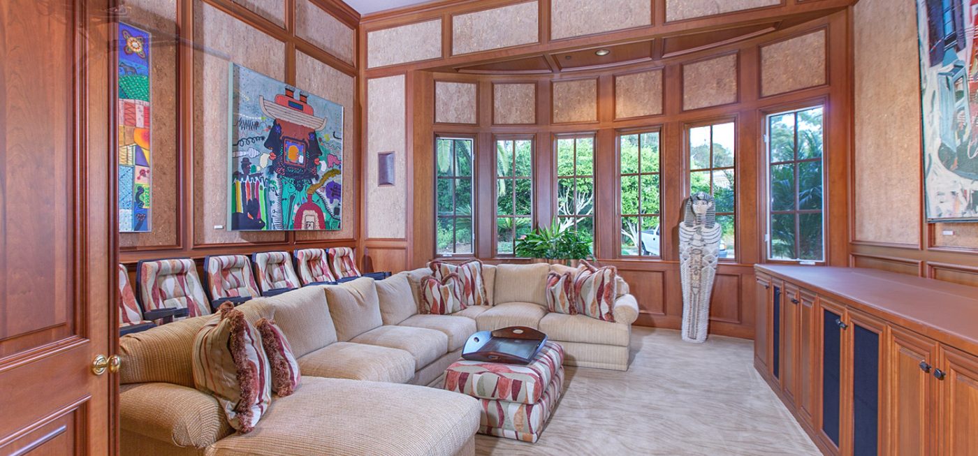A newly remodeled, gourmet kitchen features Miele and Wolf appliances, onyx and quartzite counters, and three pantries. Additional features include a formal dining room, home theater, private office outfitted in cherry wood, and a lounge with wet bar and wine storage.