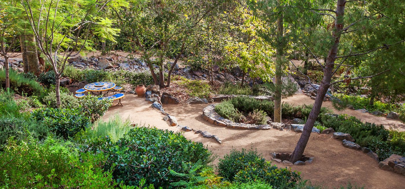 The estate’s grounds – which feature water-efficient plantings native to California – include a quarter-mile walking trail, a 200-specimen rose garden, thirty organic fruit trees, tennis court, children’s play area, and a relaxation pavilion.