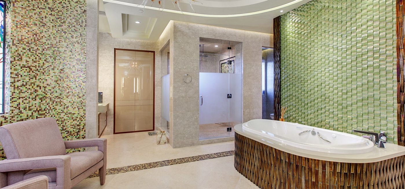 The main residence boasts elegance throughout, beginning with a grand foyer featuring marble floors, dual spiral staircases, an onyx chandelier imported from Italy, and 22.5-foot ceilings. There are seven en-suite bedrooms, including a stunning master suite with a private elevator and a spa-inspired bathroom that offers custom Italian glass tile, an infrared sauna, steam shower, soaking tub, heated floors and two custom closets.