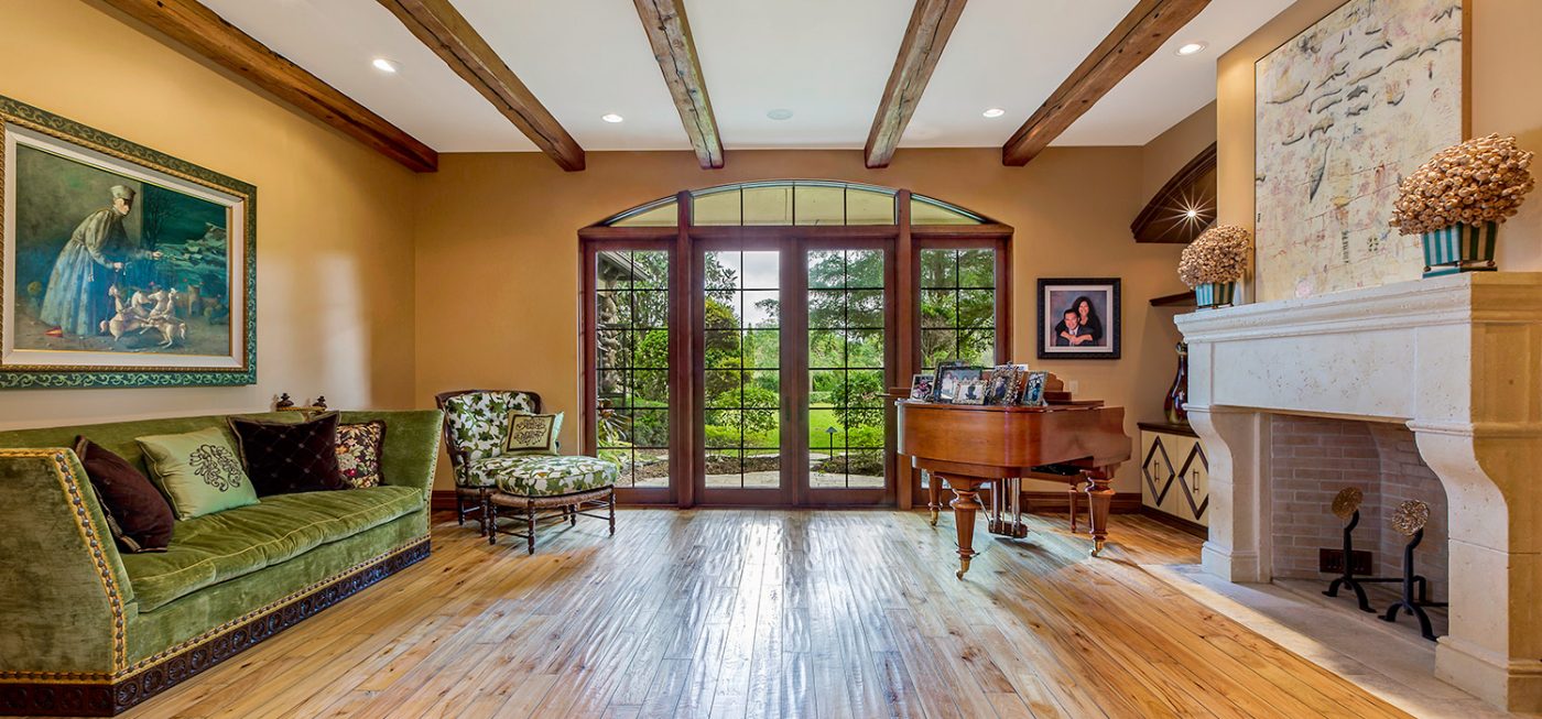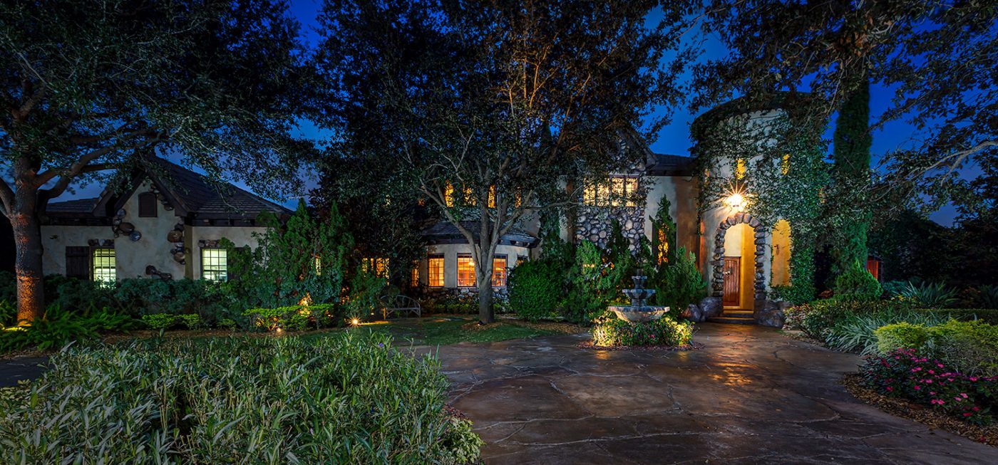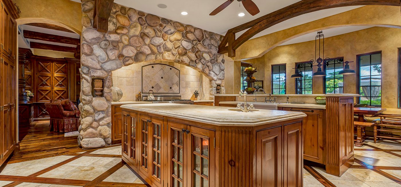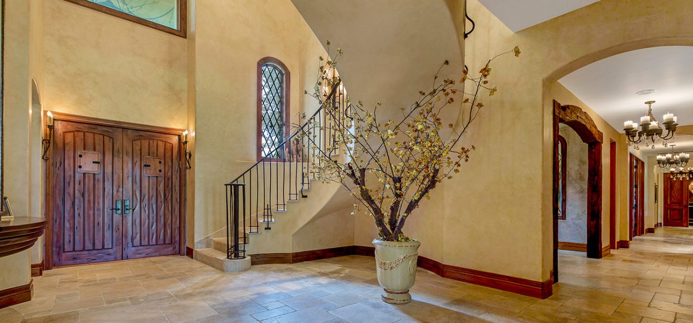 The luxurious, “country home” ambiance of the residence is apparent upon arrival. Once passing through the private gates a quaint, courtyard-like entry beckons, boasting custom landscaping, a fountain, and the beautiful, stone-accented façade of the estate.