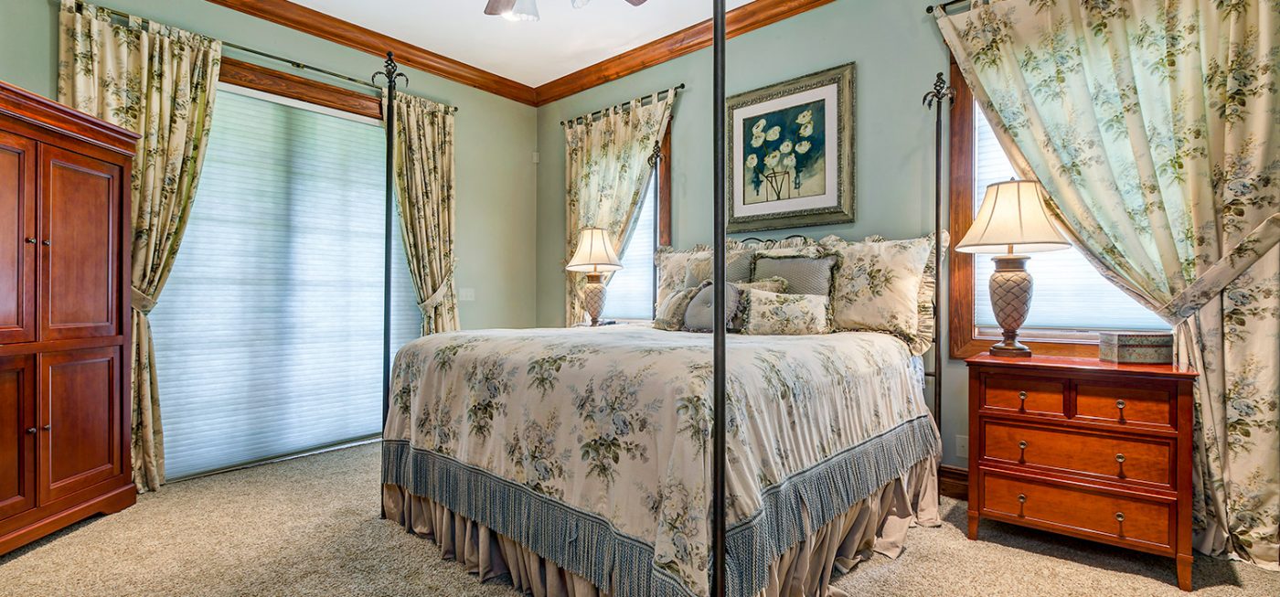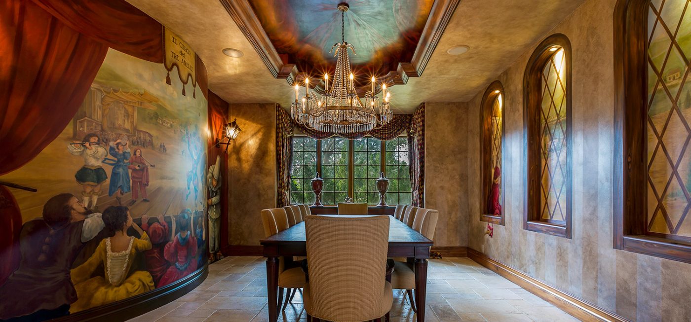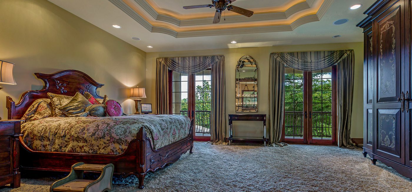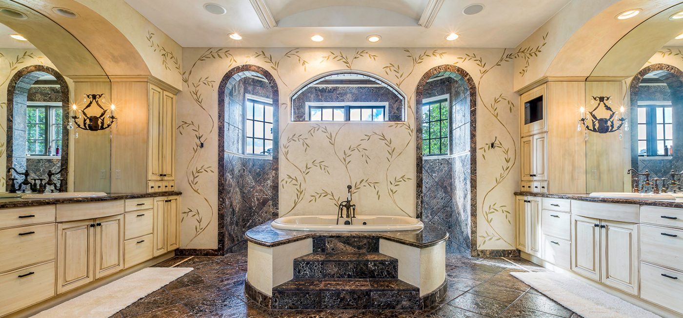 The luxurious, “country home” ambiance of the residence is apparent upon arrival. Once passing through the private gates a quaint, courtyard-like entry beckons, boasting custom landscaping, a fountain, and the beautiful, stone-accented façade of the estate.