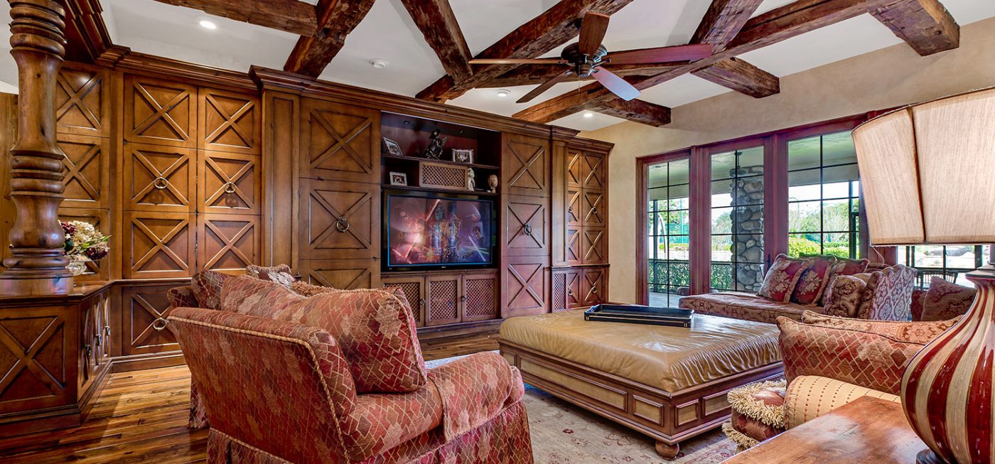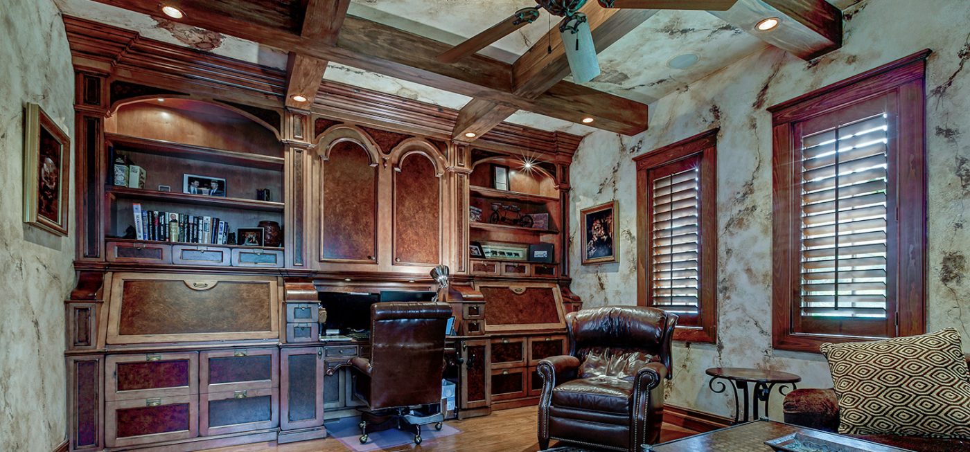 Inside the home, features such as lofted ceilings with exposed beams and trusses (composed of genuine wood repurposed from New England barns), hardwood floors, and custom built-ins add to the Tuscan ambiance.