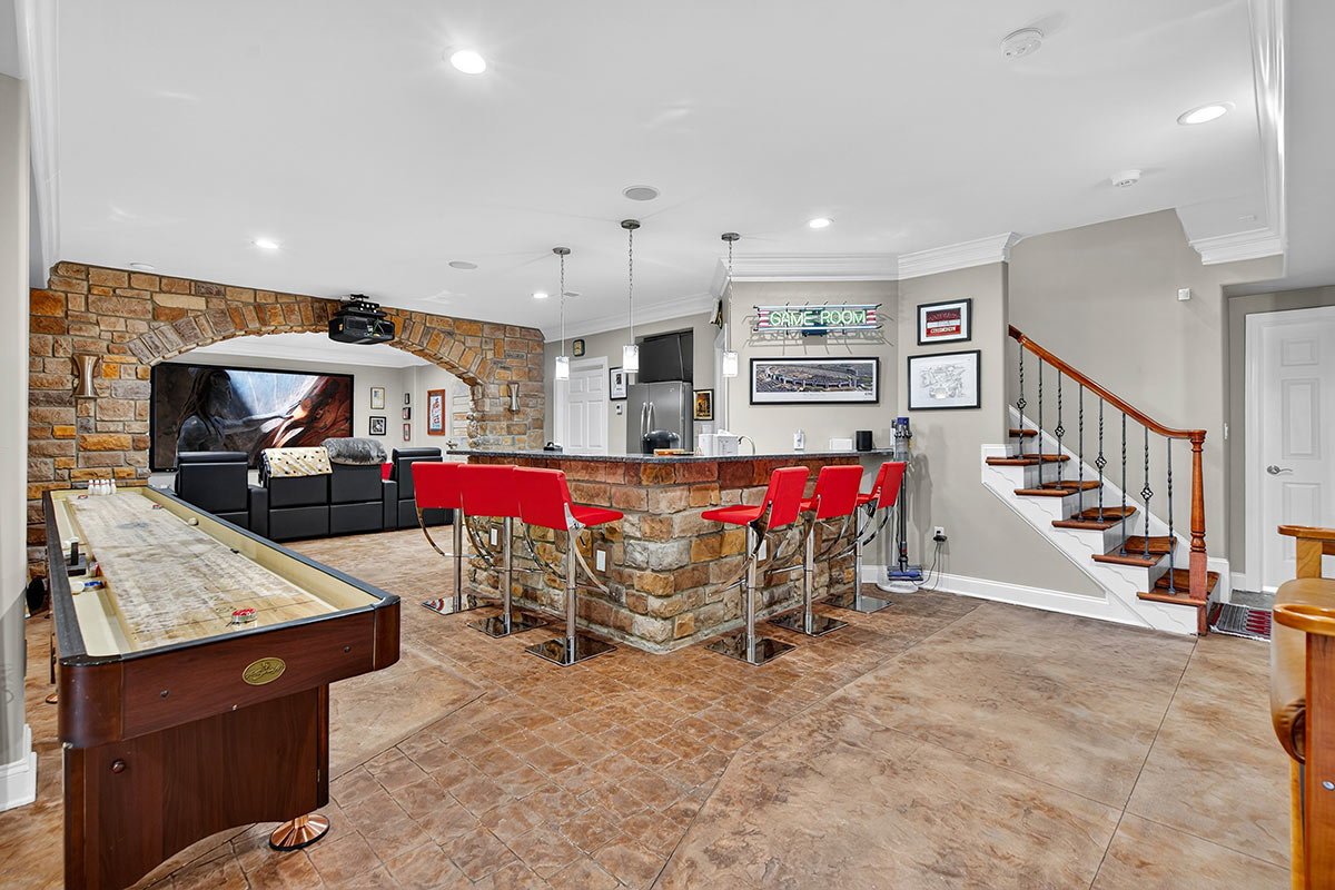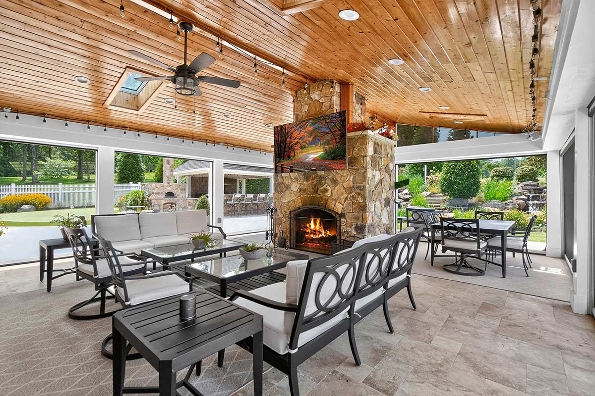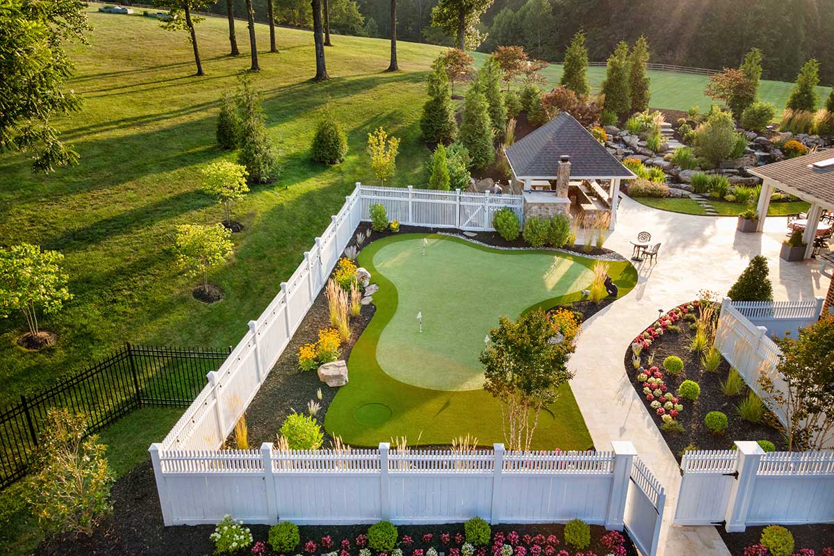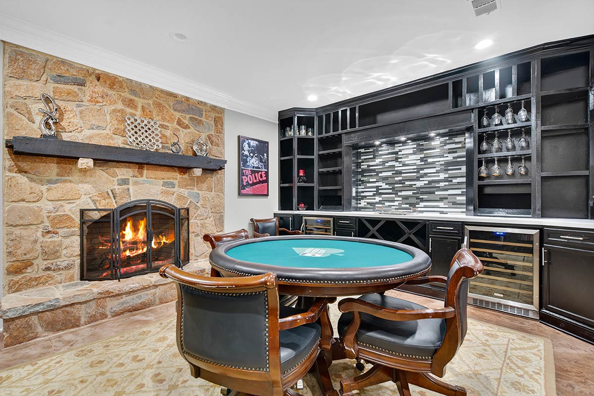 Outdoor living areas are equally refined, with rear grounds anchored by a granite pool and spa with cascading waterfalls, a stone patio, lush landscaping, and programmable lighting. A firepit terrace and outdoor kitchen—featuring a Forno Bravo pizza oven, Blaze grill, Memphis pellet smoker, and bar seating—create the perfect outdoor setting. Recreational enthusiasts don’t even have to leave the property, as a PGA-quality putting green and chipping area, along with a stocked 1.8-acre pond complete with dock, keep activities at your fingertips.
