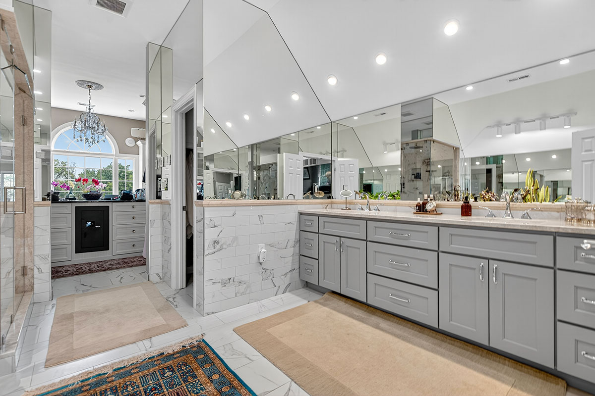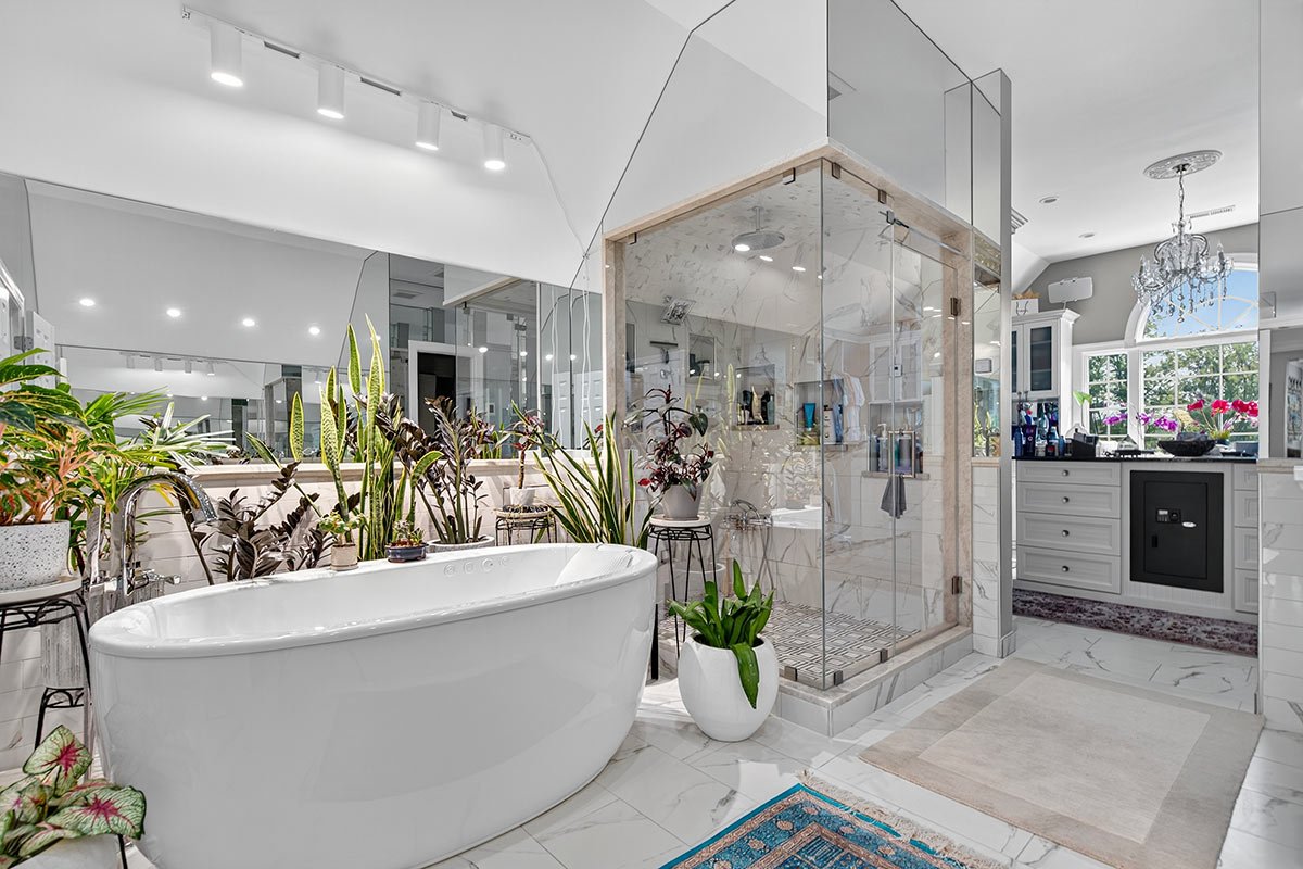 Newly refinished cherry wood floors, soaring ceilings, and abundant natural light define the interiors. The 2021-renovated gourmet kitchen is equipped with Wolf and Sub-Zero appliances, granite countertops, under-cabinet lighting, and a generously-sized island. Formal rooms transition seamlessly to a richly appointed library and a sunroom overlooking the gardens. The primary suite serves as a private retreat, complete with a spa-inspired bath featuring radiant heated floors, a steam shower, an oxygenated Jacuzzi tub, and custom California Closets. Four additional bedrooms with en-suite baths provide space for family and guests, while the lower level offers ample options for entertainment, including a dry redwood sauna, fitness room, home theater, and wine bar.
