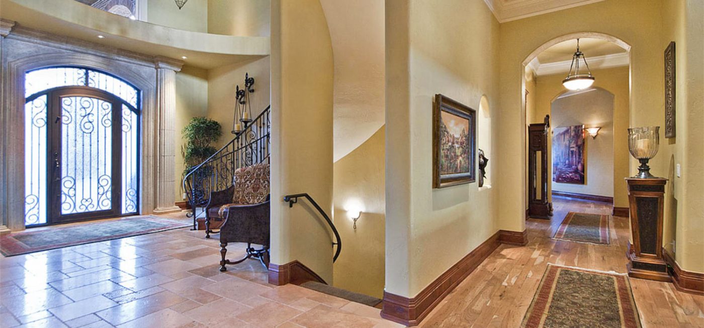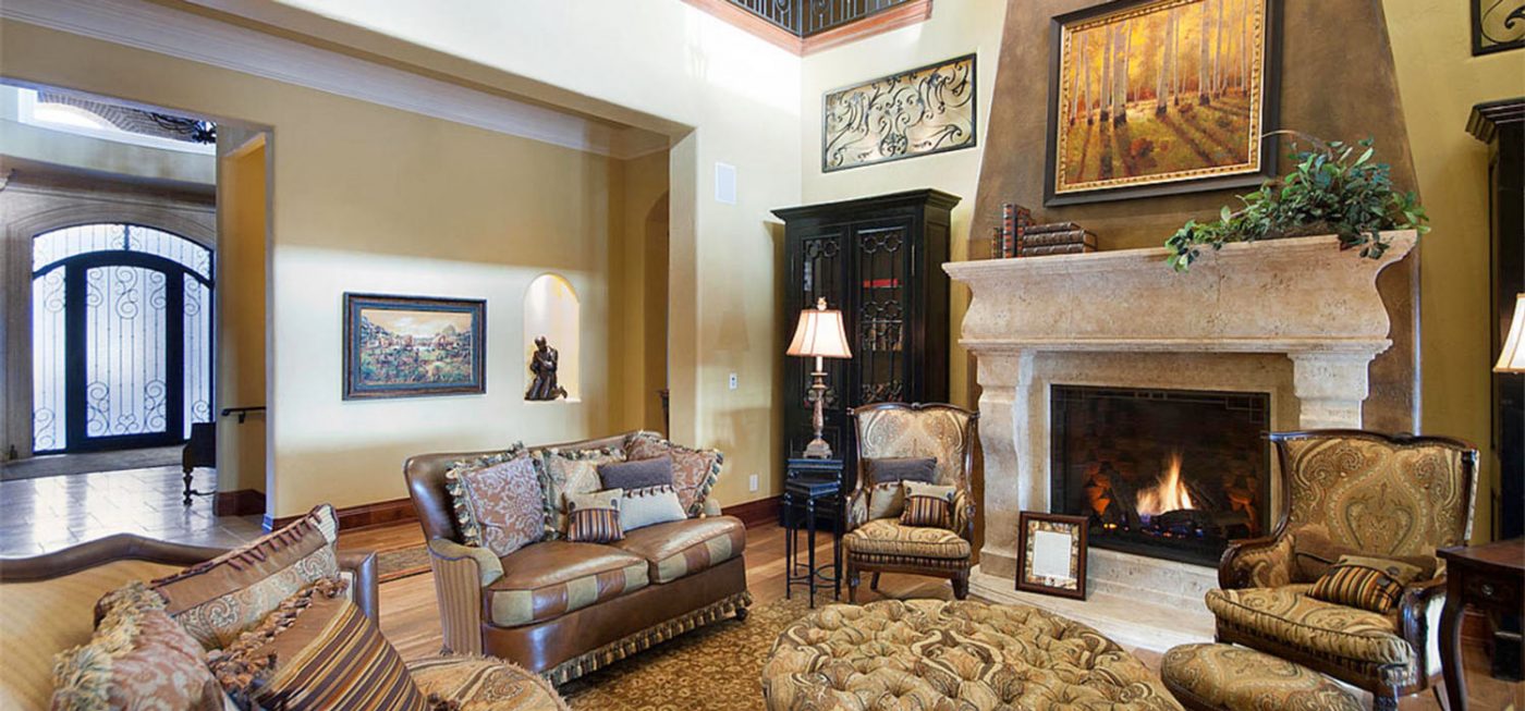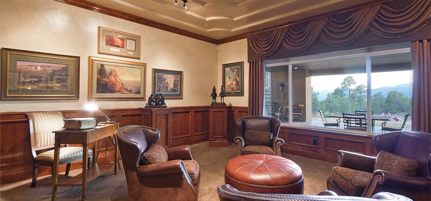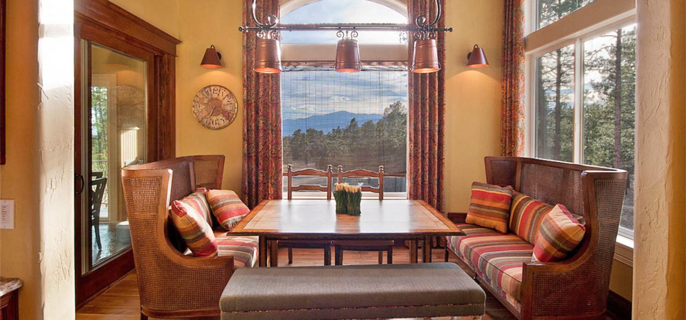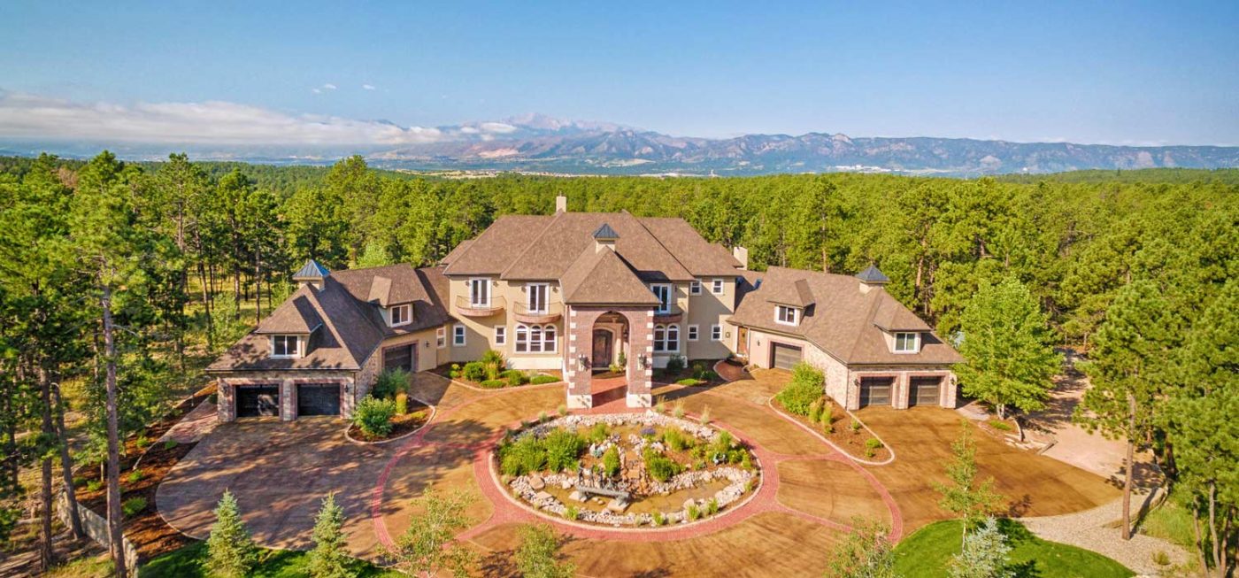The approach to the home includes beautiful, natural surroundings and Ponderosa pines, and concludes with a stately, circular drive and two-story porte cochère. A spectacular view of Pikes Peak provides the backdrop.