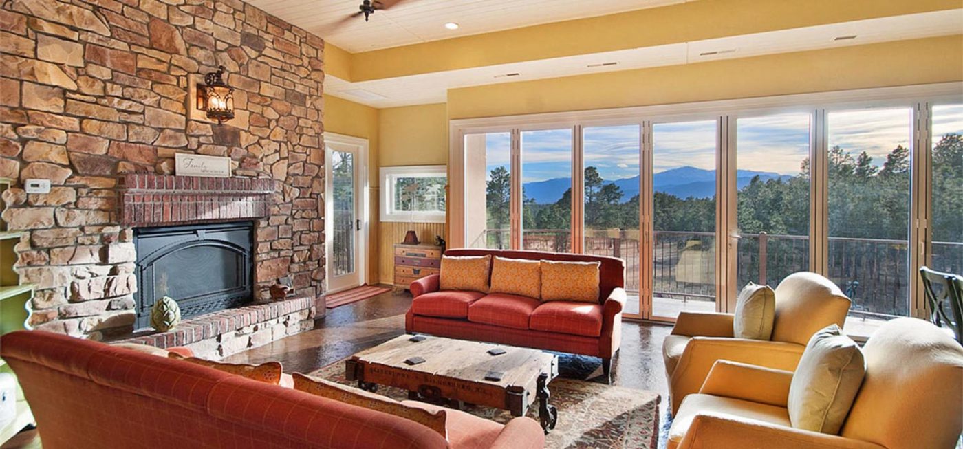 Entry-level entertaining areas include a grand salon and spacious sunroom separated by a wall of folding glass doors, which can be opened to create one large space perfect for family gatherings. The fully enclosed sunroom also features floor-to-ceiling glass doors that open onto an oversized terrace, creating an indoor / outdoor living space that takes advantage of the incomparable views – including a direct view of Pikes Peak (one of Colorado’s most famous “fourteener” mountains).