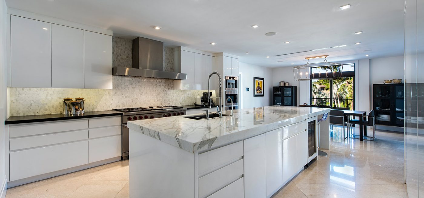 A gourmet kitchen offers a suite of Miele, Wolf and Sub-Zero appliances, white-lacquered cabinets and custom countertops comprised of only two slabs of Calacatta marble. Nearby is a magnificent wine room, carefully designed by the present owner and sure to please even the most particular oenophile!