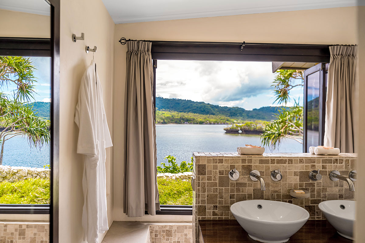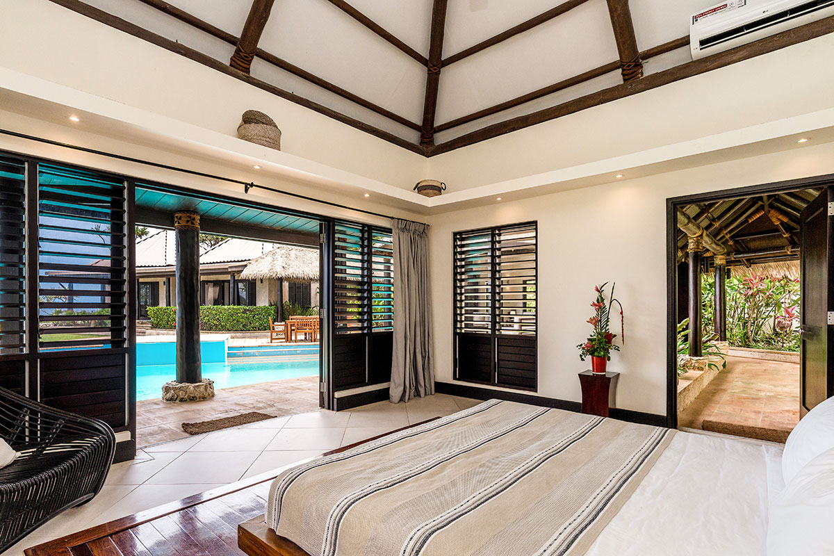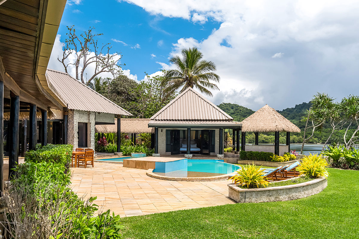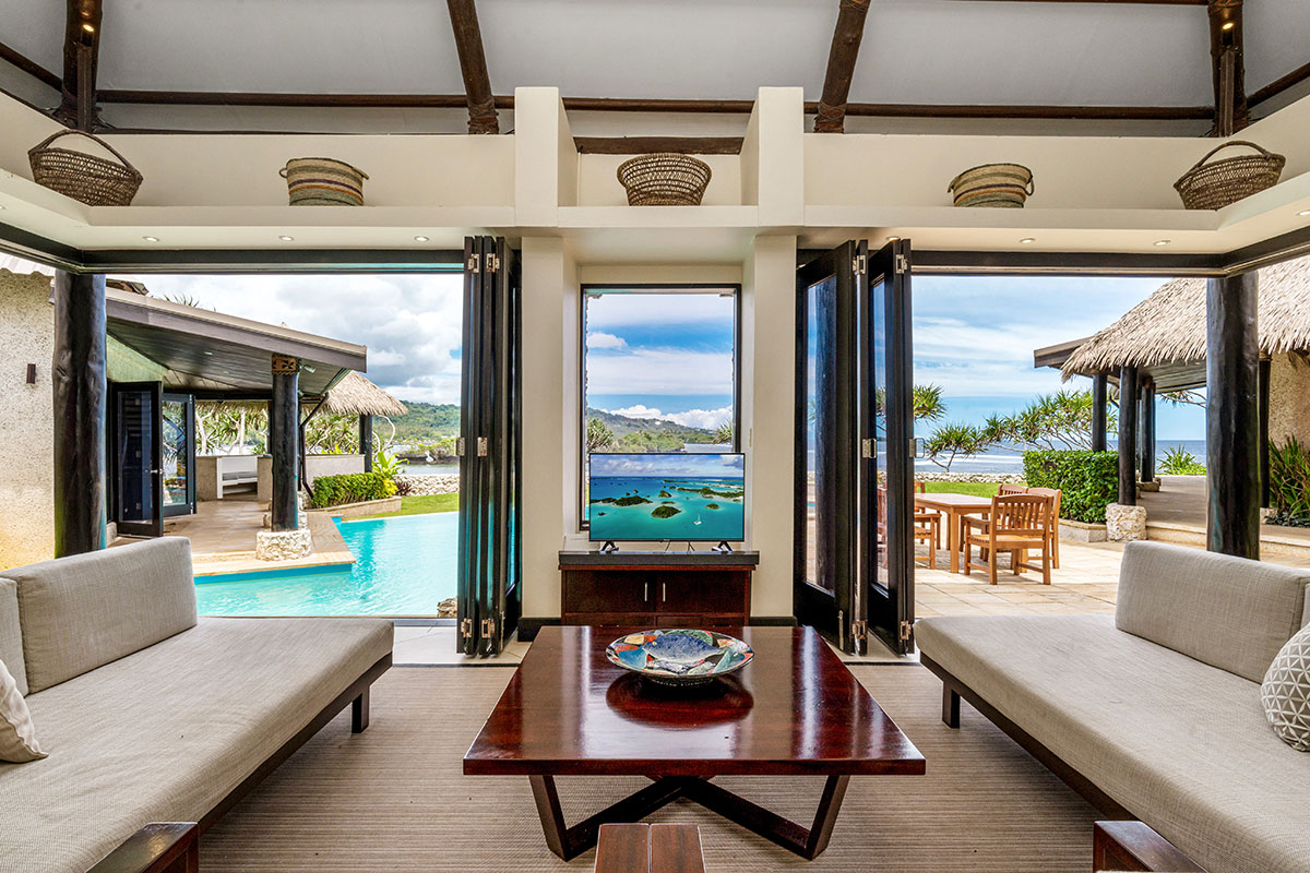 The island’s centerpiece, the Signature Villa, occupies one manicured acre overlooking the sparkling Koro Sea. Designed to complement its tropical surroundings, the residence offers over 3,000 sf of refined living space. Architectural highlights include a horizon-edge pool and wet-edge spa, a daybed pavilion, a barbecue gazebo, a three-vehicle garage, and covered walkways paved in teak stone. Inside, the villa’s open-plan layout centers around the kitchen, dining, and lounge areas with outdoor living spaces that frame panoramic ocean views. The primary suite features a spacious bathroom and dressing room that open directly to the patio and pool, while two additional bedrooms share a bath and enjoy similar access to the outdoors.