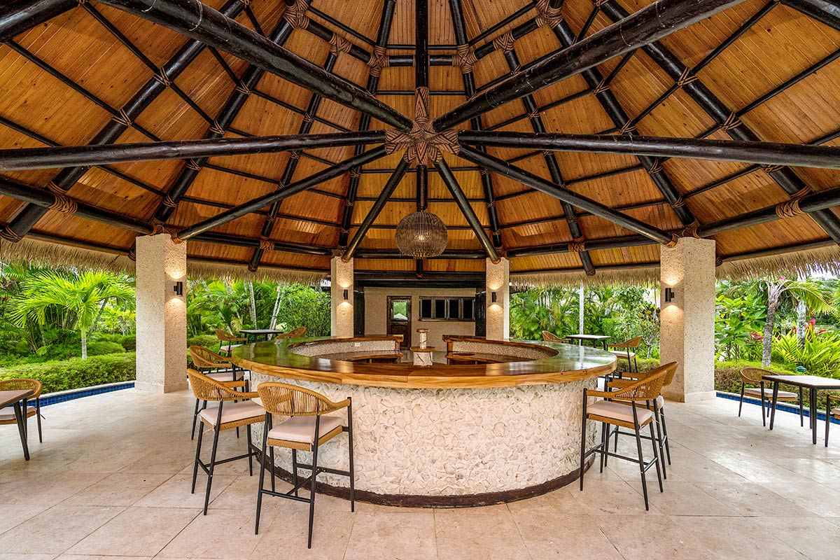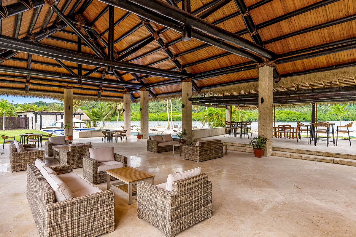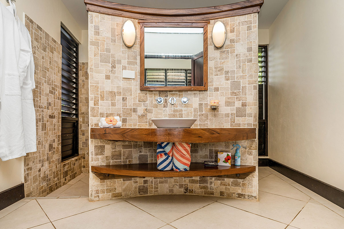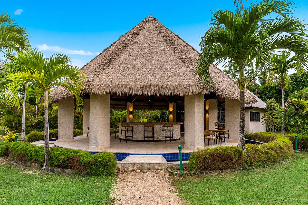 The island’s centerpiece, the Signature Villa, occupies one manicured acre overlooking the sparkling Koro Sea. Designed to complement its tropical surroundings, the residence offers over 3,000 sf of refined living space. Architectural highlights include a horizon-edge pool and wet-edge spa, a daybed pavilion, a barbecue gazebo, a three-vehicle garage, and covered walkways paved in teak stone. Inside, the villa’s open-plan layout centers around the kitchen, dining, and lounge areas with outdoor living spaces that frame panoramic ocean views. The primary suite features a spacious bathroom and dressing room that open directly to the patio and pool, while two additional bedrooms share a bath and enjoy similar access to the outdoors.