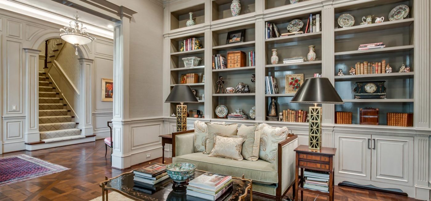 A fireplace warms the living room, and beautiful built-in cabinets with glass doors showcase objects d’art and collectibles. Directly adjacent to the foyer, an intimate study features built-in bookcases and rich, wood-paneled walls.