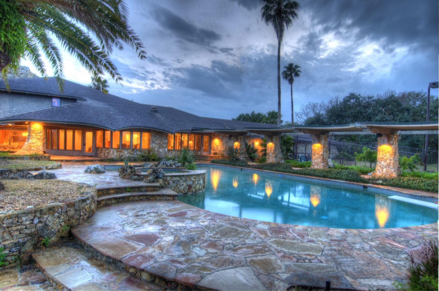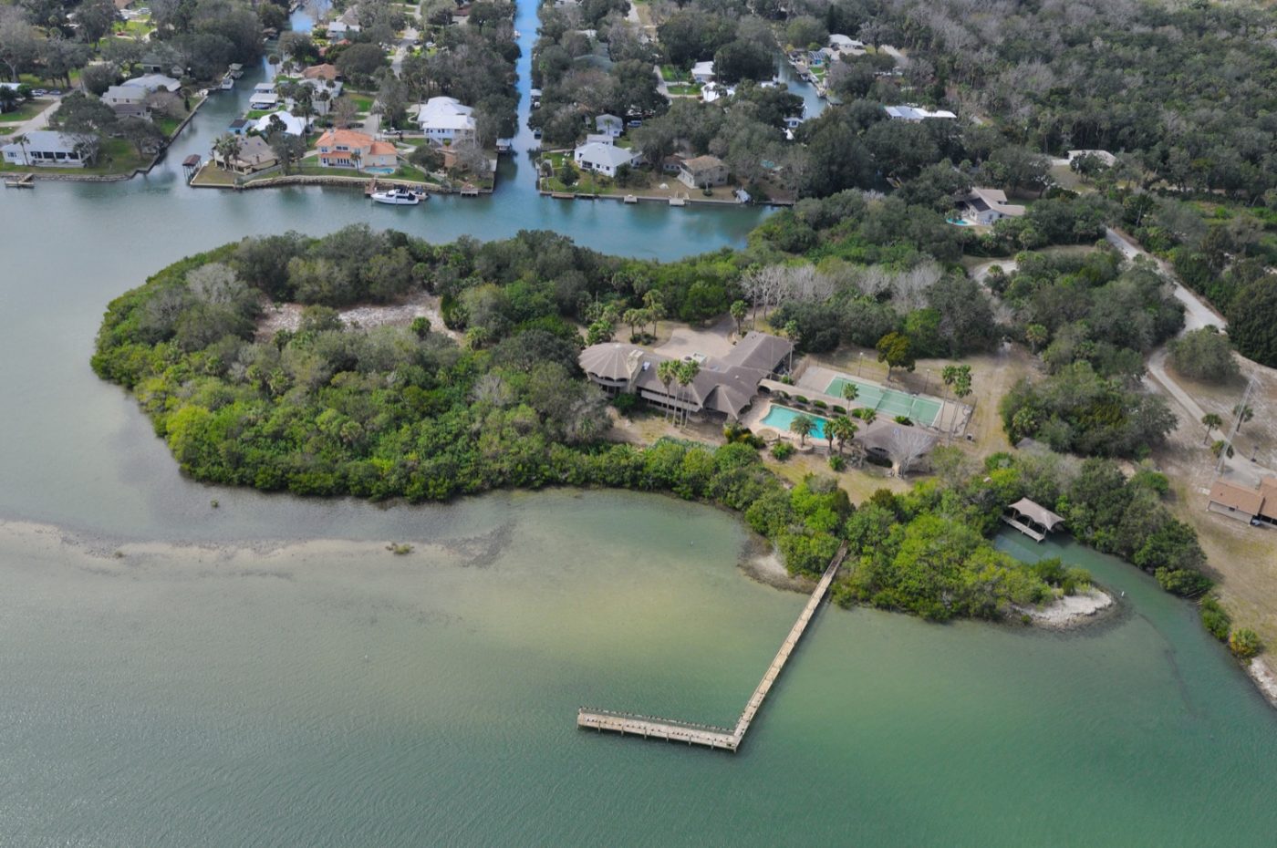 Sportsman’s Paradise! This private and exotic waterfront compound is situated on an immense point lot and features a large primary residence, separate guest house, tennis court, lagoon-style pool and large boat dock.