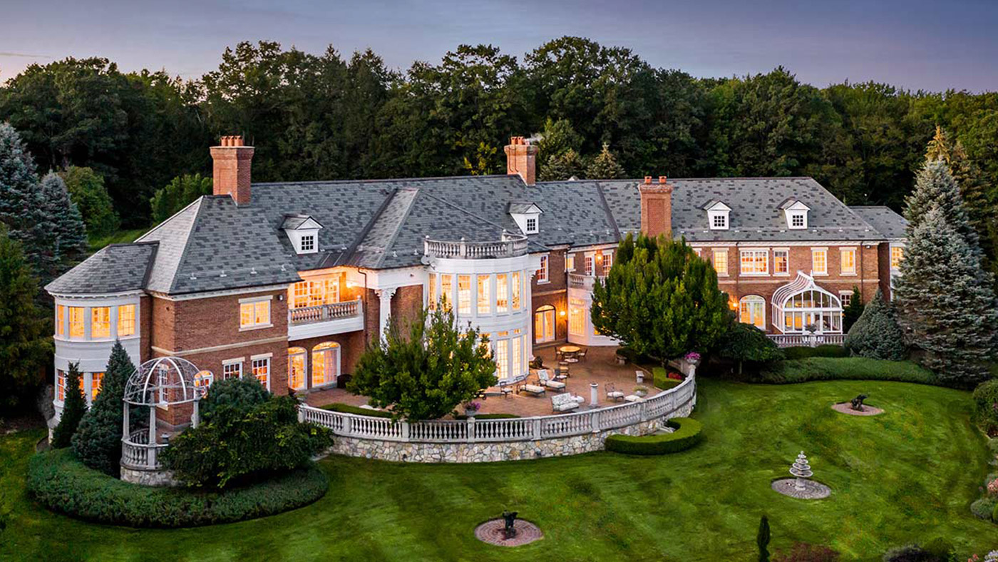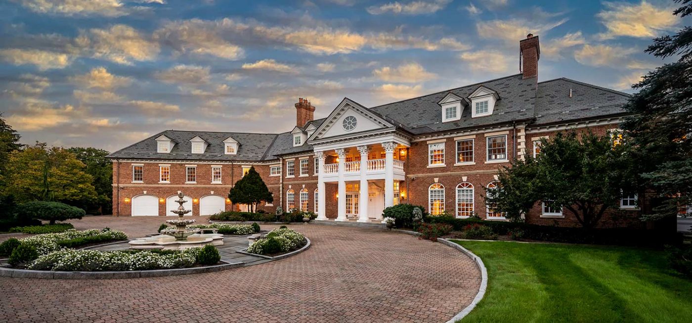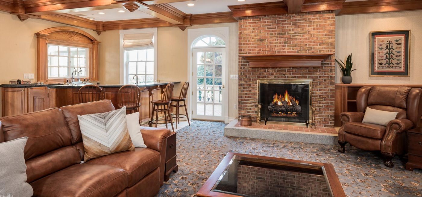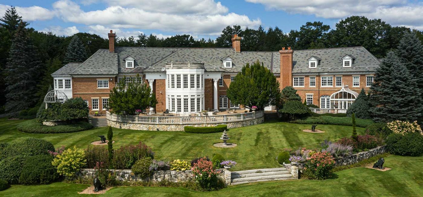 This Georgian Colonial residence located in southern New Hampshire has a regal brick exterior, and brand-new slate roof (with new copper gutters) that sets off a handsome front portico supported by Corinthian columns. Beautiful interior millwork frames fireplaces, doorways and stairs in an elegant, formal style. The grand foyer – complete with two-story iconic columns and a stunning Schonbek crystal chandelier – is graced with a double staircase leading up to a spacious sitting area with breathtaking hillside views of the New England landscape.