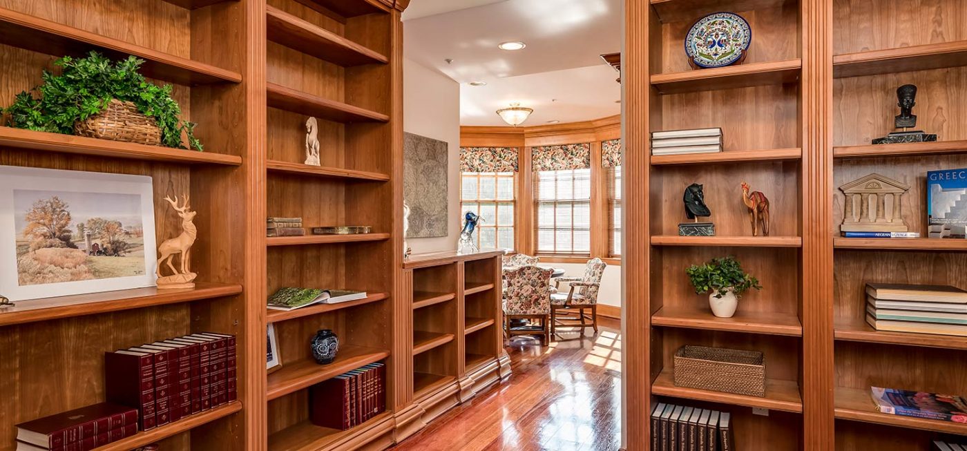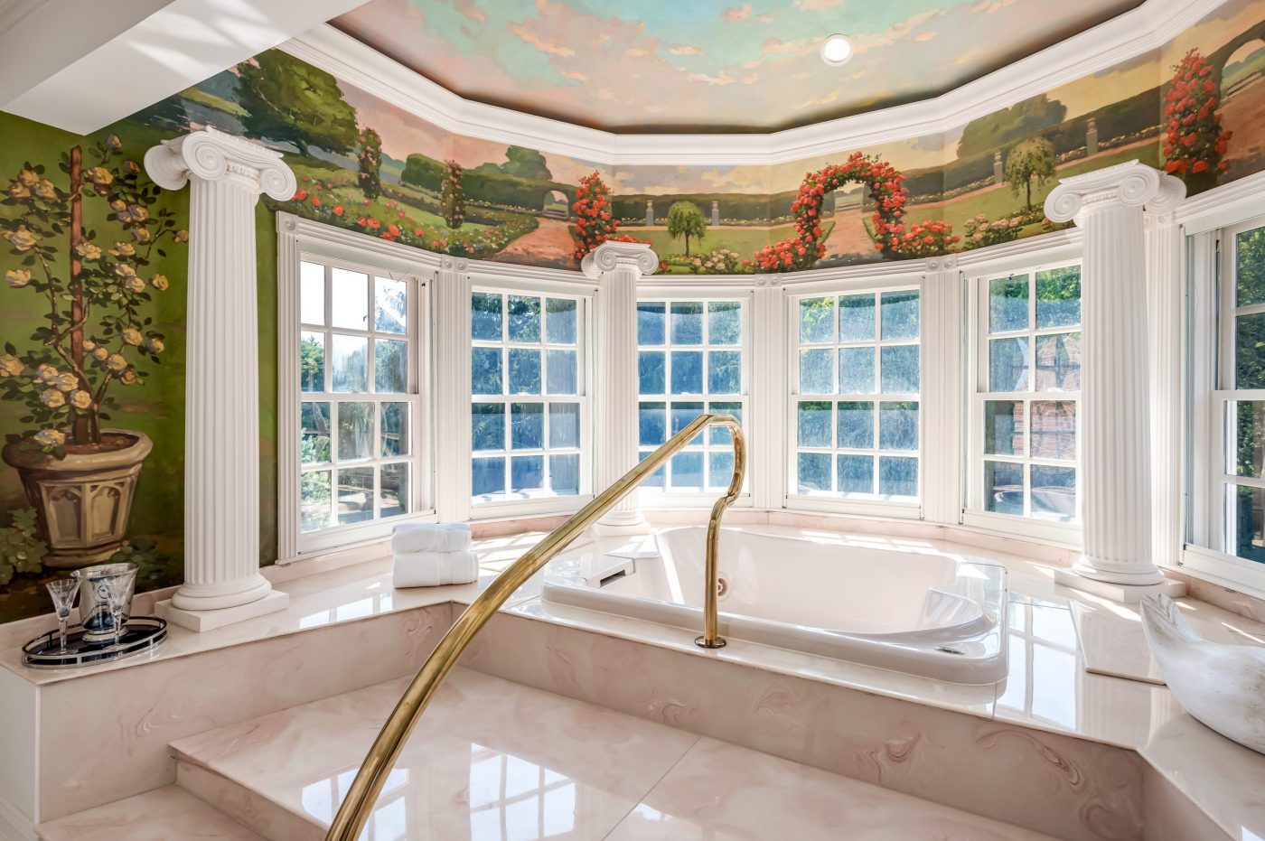 Upstairs, each well-appointed bedroom has an en-suite bath, some with delightful murals by artist John C. Traynor gracing the walls. The master suite is especially lovely, and offers walls of windows, a fireplace, and bathroom with a large, jetted tub set next to a bow window overlooking the grounds. A double vanity, shower, dressing area and his-and-hers walk-in closets complete the suite, which encompasses an entire wing of the upper level. Other rooms include a handsome library, executive office, cheerful sewing room and a fitness center adjacent to the pool. The Property also offers a studio apartment over the attached garage, and a detached, 4-car garage in the style of a traditional red barn.
