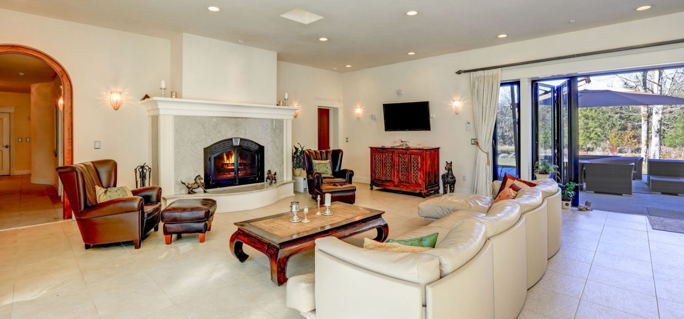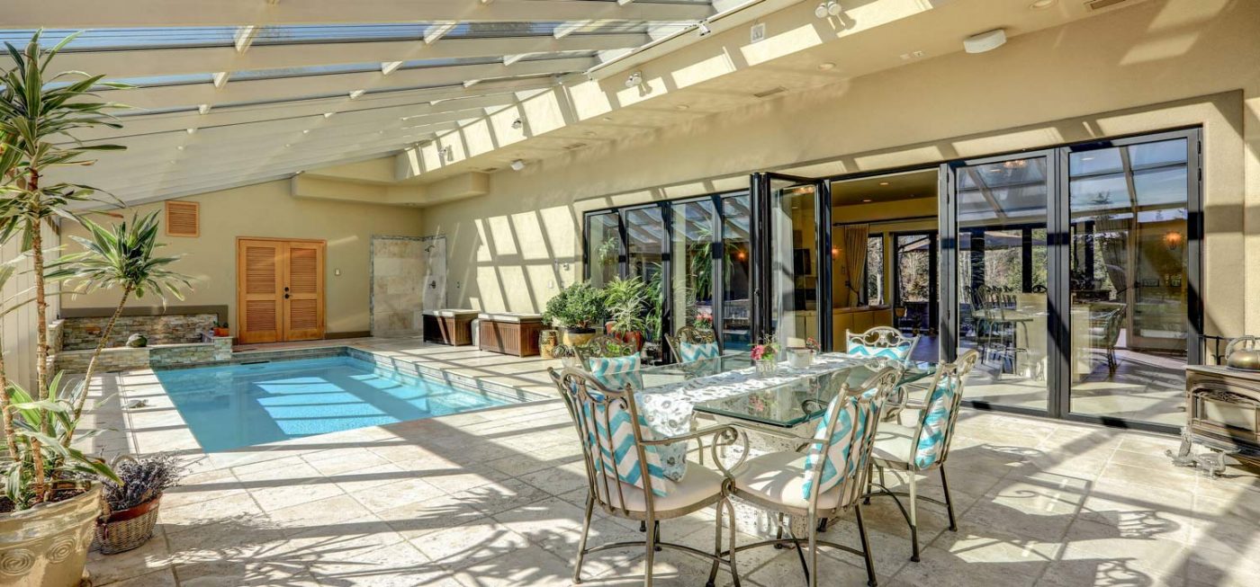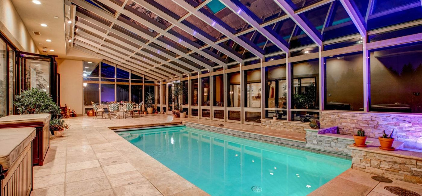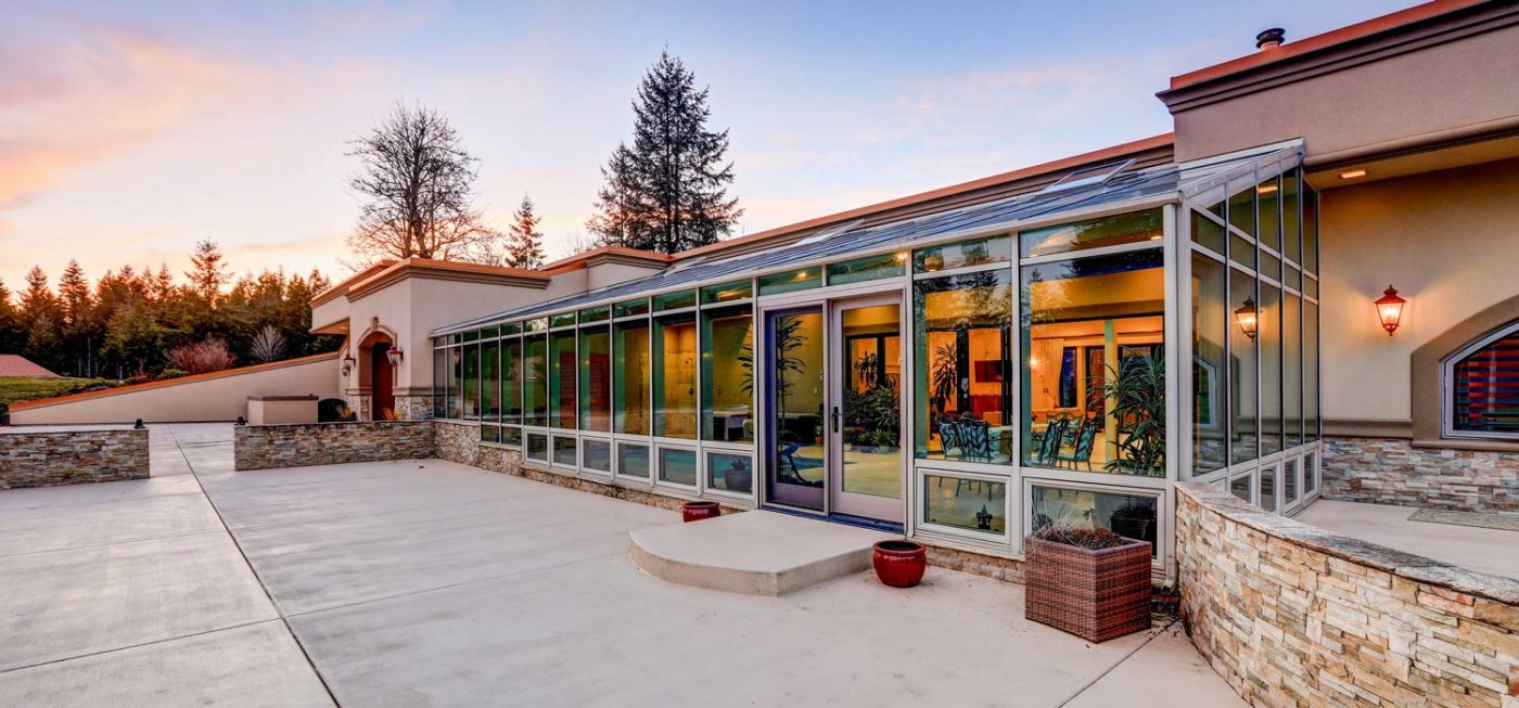 The main residence is constructed wholly of concrete, and spans 5,700 sf with 5 bedrooms, 3 full and 1 half bath. A beautiful approach to the entry is lined with mature evergreens, and a decorative motor court provides a memorable first impression. An attached, two-car garage offers covered parking, but parking for many additional vehicles is available on the motor court itself. Entertaining areas are spacious and include an open concept kitchen and living room with fireplace that opens via floor-to-ceiling glass doors into an indoor pool/spa and lounge. The lounge area is walled entirely in glass, including the ceiling, making this bright, sunny room the perfect place to relax with family and friends. Beyond the lounge, a large stone patio overlooks the lovely grounds, which include a whimsical treehouse with bunk beds and a lofted area that children of all ages will enjoy.