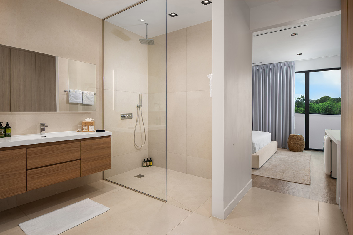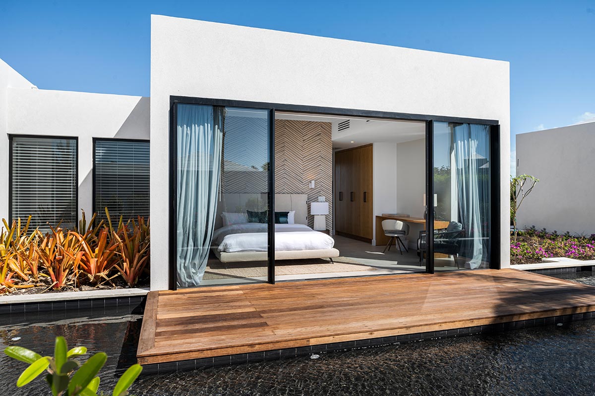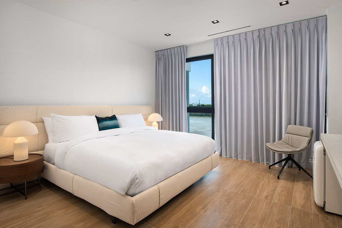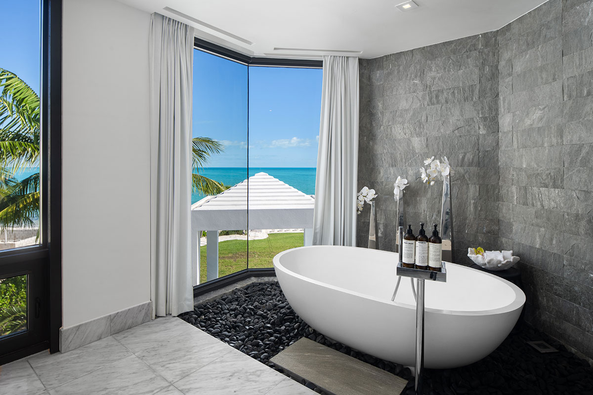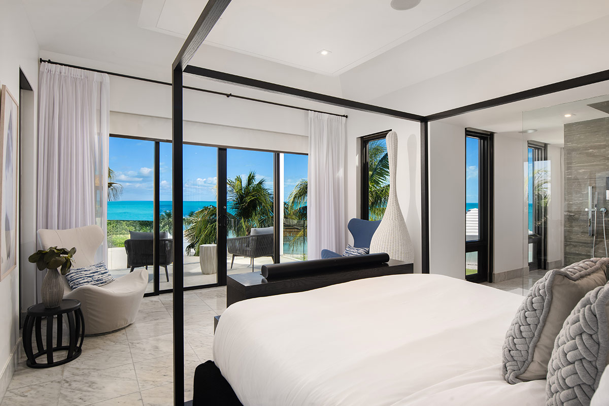 The estate includes fifteen bedrooms in total: an eight-bedroom main residence, four private garden bungalows, and three-bedroom staff quarters, allowing for both expansive entertaining and complete discretion. Floor-to-ceiling windows frame uninterrupted turquoise views, while high ceilings and open corridors invite air and light to circulate naturally throughout the home. The great room opens seamlessly to beachfront terraces, creating a fluid transition between interior and exterior living. Crisp white walls, natural woods, and soft neutral palettes establish a contemporary coastal aesthetic that feels both sophisticated and relaxed.