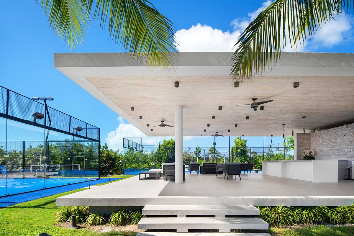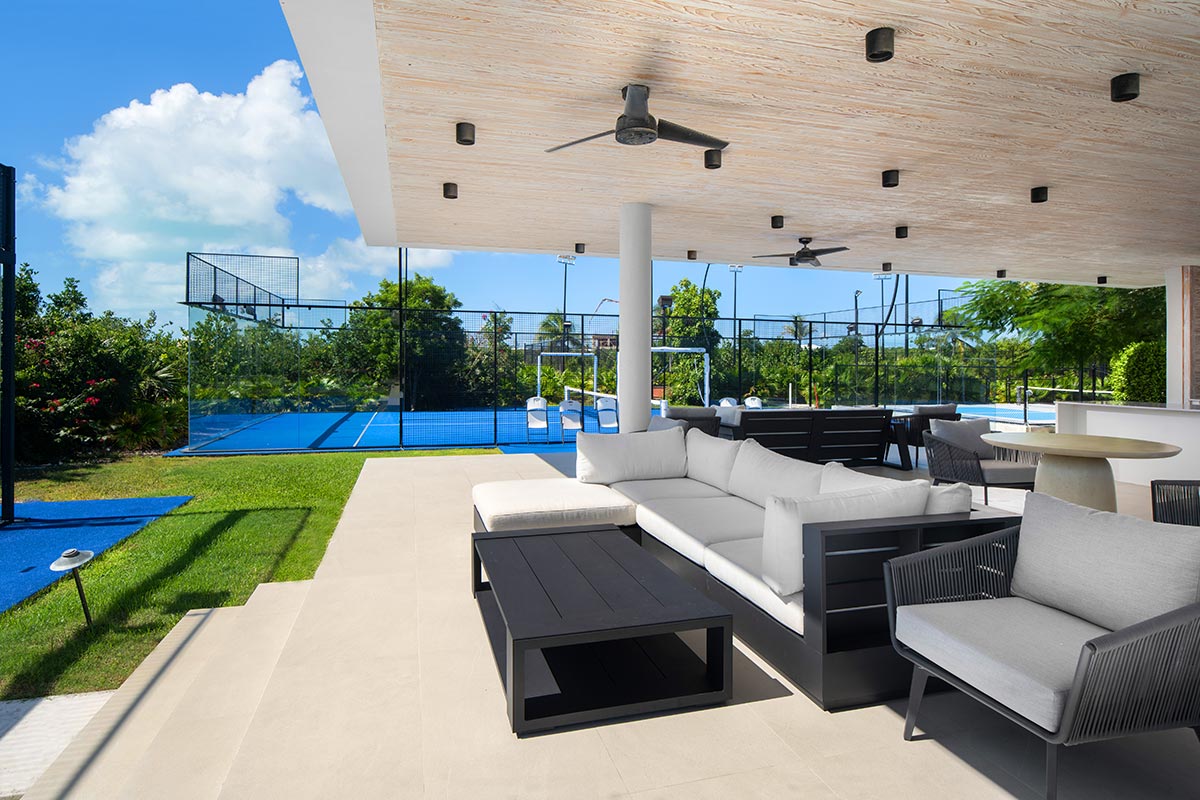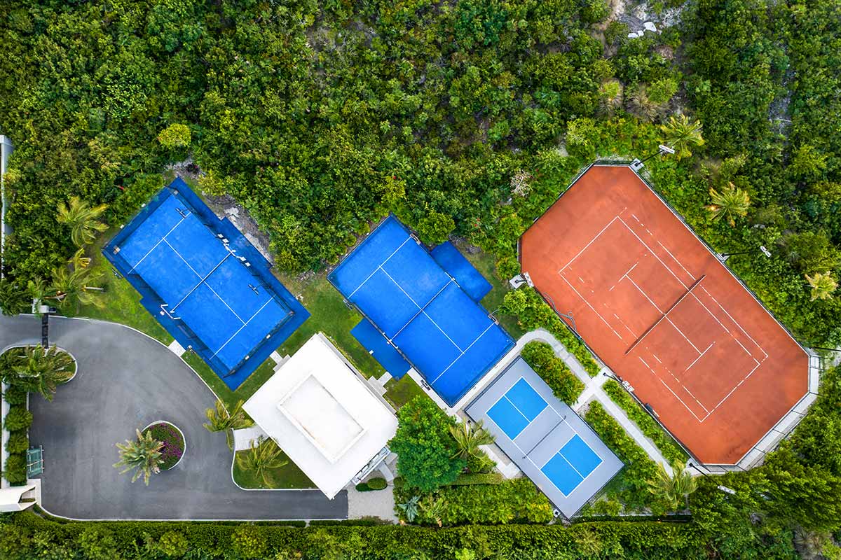 Outdoor living at Triton is equally curated. The property features two heated pools, including an infinity-edge pool with a glass wall that visually merges with the ocean horizon, along with a hot tub, cold plunge, firepit lounge, outdoor movie theater, bocce court, and multiple cabanas and terraces positioned to follow the sun. The newly constructed private sports center includes the only red clay tennis court and the only two padel courts in Turks and Caicos, in addition to a pickleball court and a covered, 1,500-sf lounge with an outdoor kitchen.