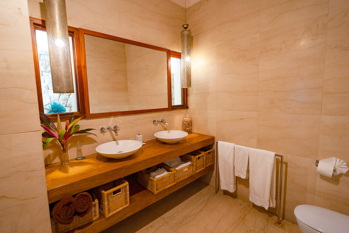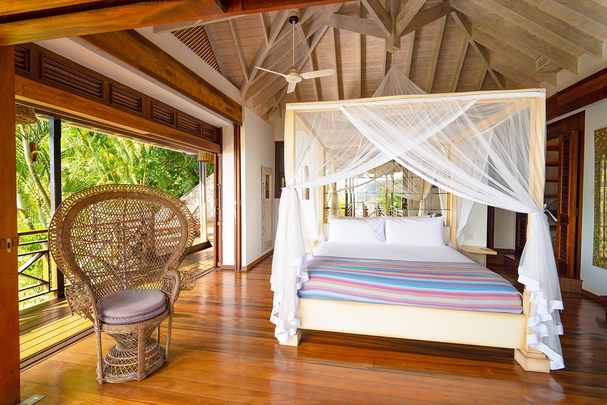 Upon arrival, a private road leads to a grand entrance framed by palm trees and vibrant tropical flowers. The villa is designed as a collection of one main residence and three elegant pavilions, each named after the island’s exotic flora—Red Heliconia, Yellow Flamboyant, and White Frangipani. The main residence serves as the heart of the villa, boasting an expansive living area, dining room, a gourmet kitchen, a guest suite and a Wind Tower, where a Murano glass chandelier illuminates an inlaid marble compass rose. Each pavilion features two spacious bedrooms with air conditioning and en-suite bathrooms, plus a wet bar and a private deck with breathtaking ocean views.