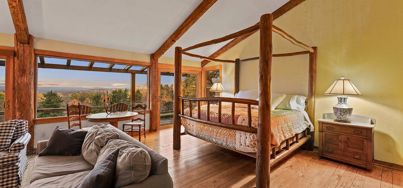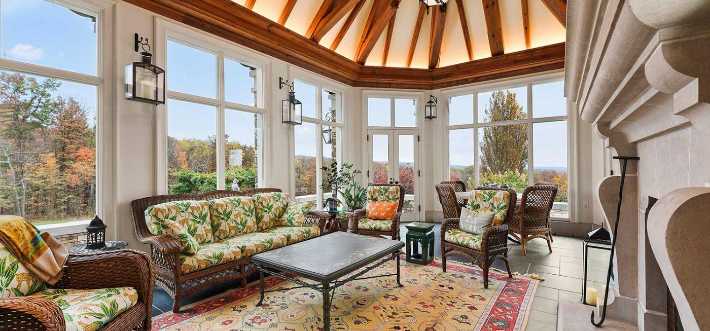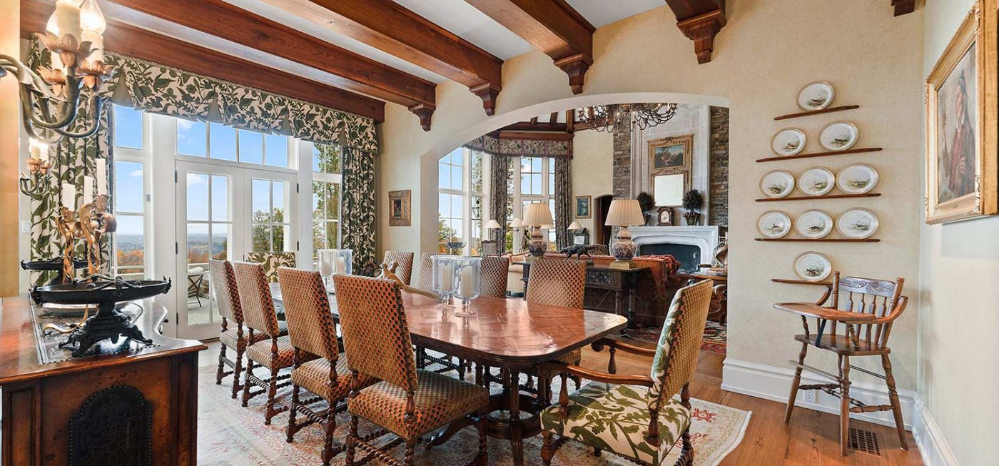 A winding, gated drive weaves through the wooded lot, finally opening onto an expansive, motor court lined with Belgian block and the welcoming entry of the stone-clad residence. The main living levels offer open spaces for dining and entertaining, centered around a grand salon with massive stone fireplace, exposed wood beam ceiling, and commanding views of manicured lawns and Ligonier’s rolling hills. Five wood-burning fireplaces warm the residence in cooler months, and a screened, four-season porch boasts an outdoor grill and fireplace perfect for hosting family and friends.