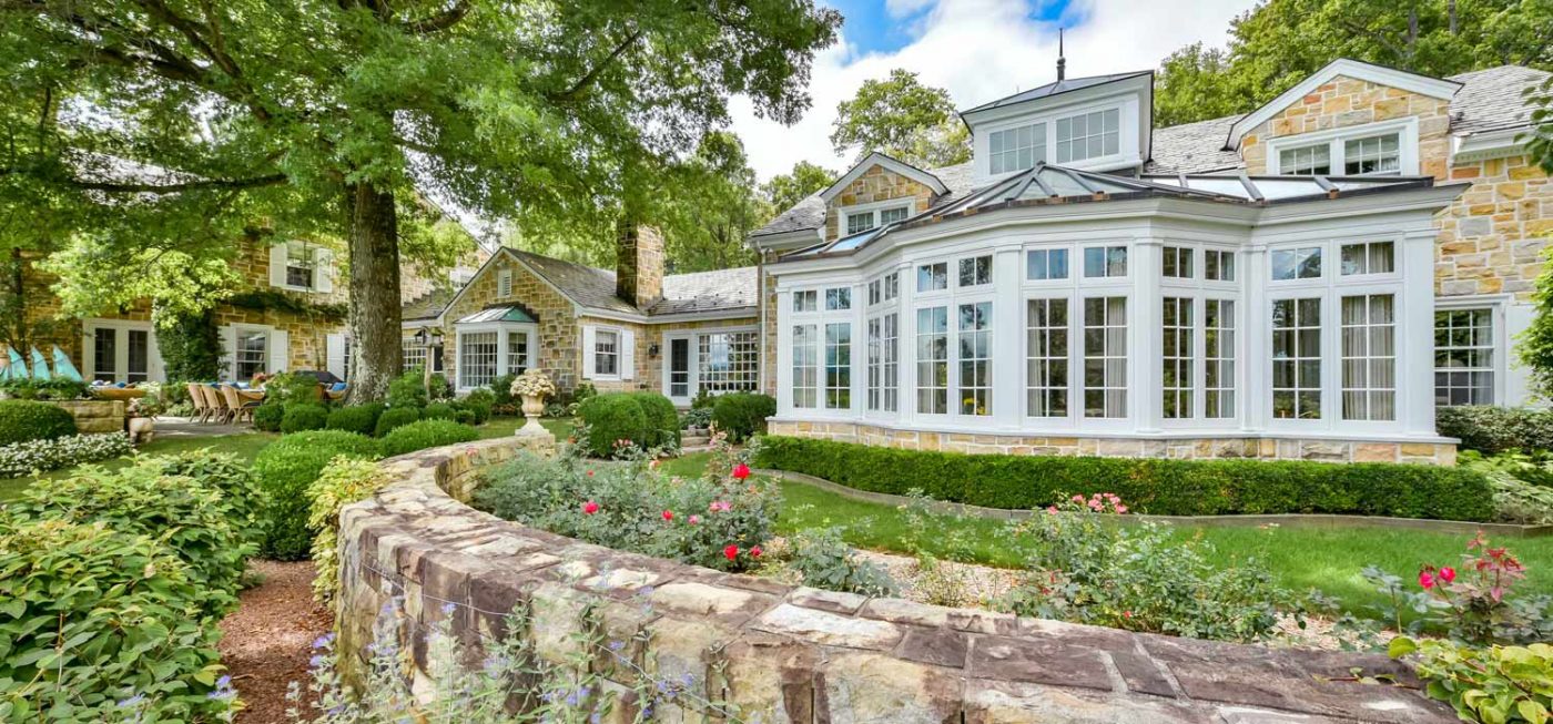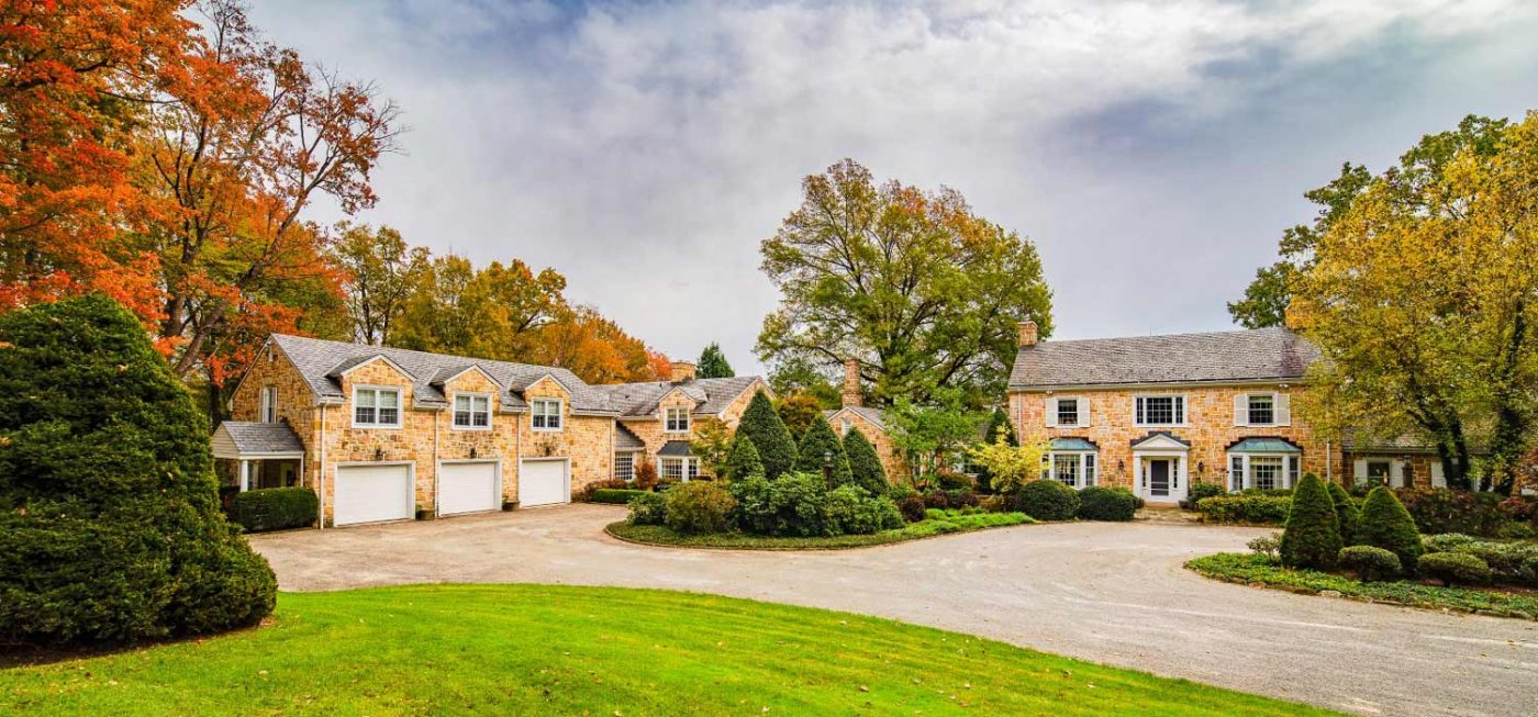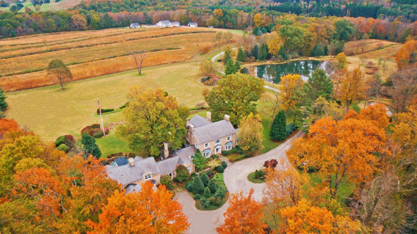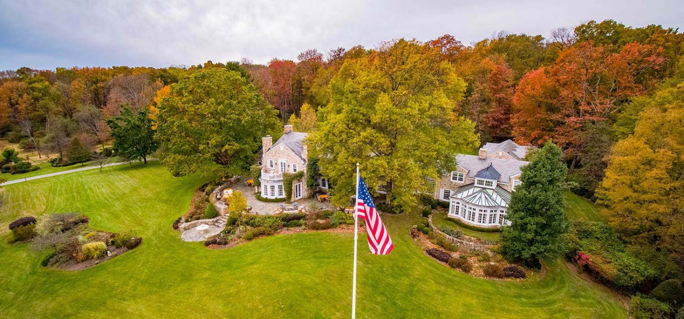 Cherished and maintained to perfection by the same family for more than thirty years, Woodmere offers beautiful country views and miles of walking trails for enjoying the great outdoors. The property’s handsome sandstone exterior and slate roof present an Old-World design influence, while interiors boast a relaxed, understated elegance.